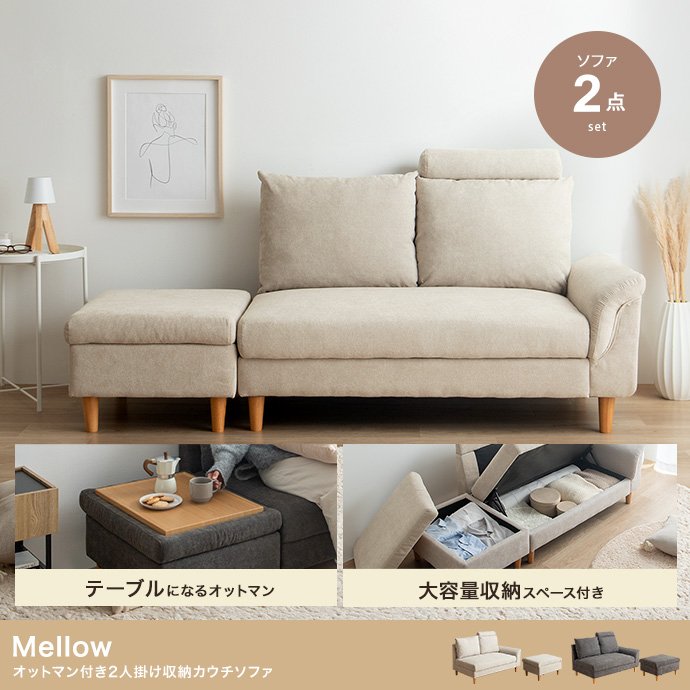 【2点セット】オットマン付き2人掛け収納カウチソファ